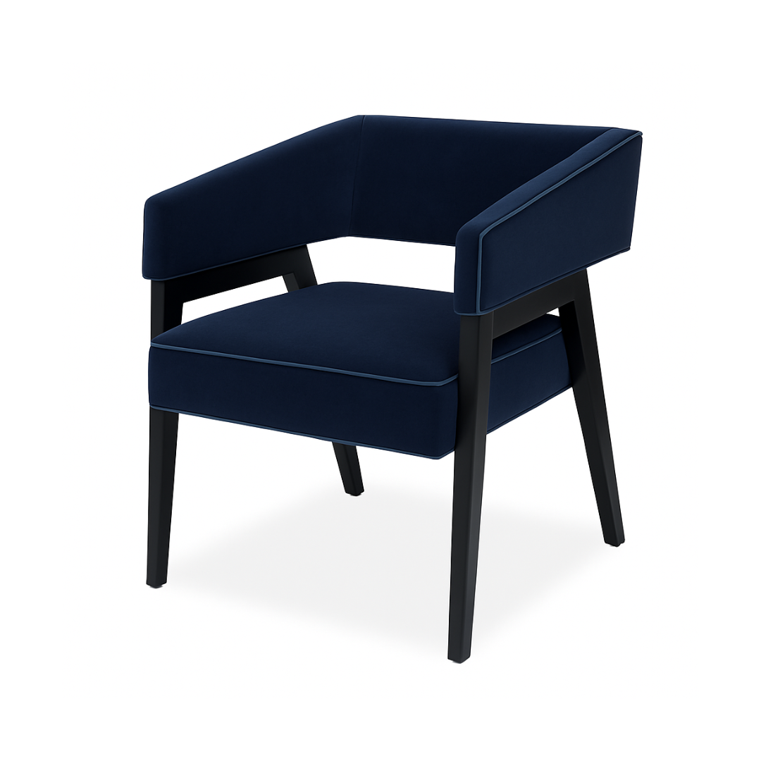 This modern accent chair features a sleek, open-back design upholstered in rich midnight navy velvet with subtle matte blue piping for a refined contrast. Its angular black frame and plush cushioning combine contemporary elegance with timeless sophistication.