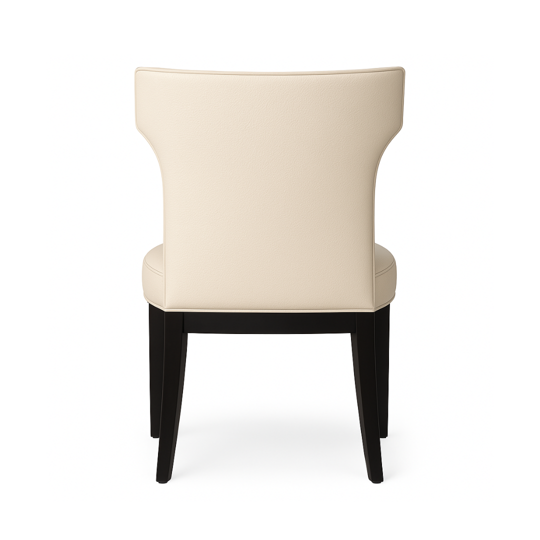 The Manhattan Dining Chair combines modern elegance with timeless comfort, upholstered in soft ivory faux leather with a smooth, refined finish. Its sculpted back and dark wood legs create a sophisticated contrast perfect for contemporary dining spaces.