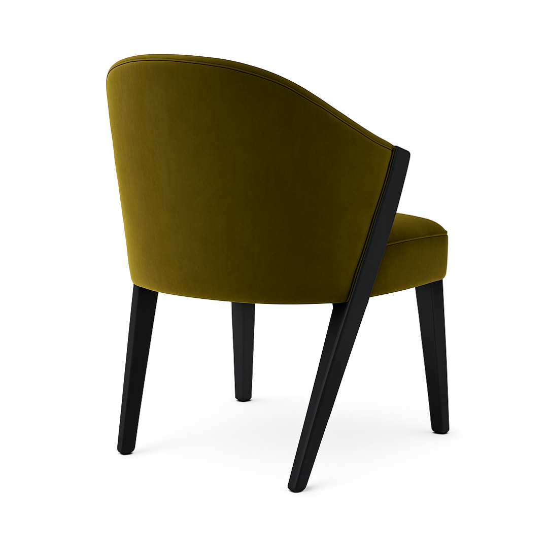 This elegant accent chair features rich olive-green velvet upholstery and sleek black wood detailing. The front legs flow seamlessly into curved armrests that wrap around the back, creating a sculptural, modern silhouette that feels both refined and inviting.
