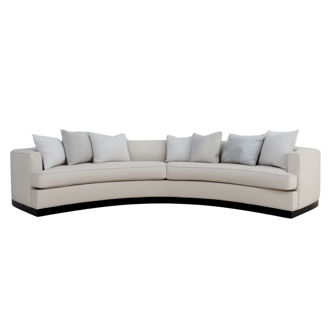 With its sweeping curved silhouette and tailored detailing, the Nina Sofa brings understated elegance to any space. Finished with a dark wood plinth and layered neutral cushions, it offers both comfort and sculptural presence. Bespoke sizes and fabrics available.